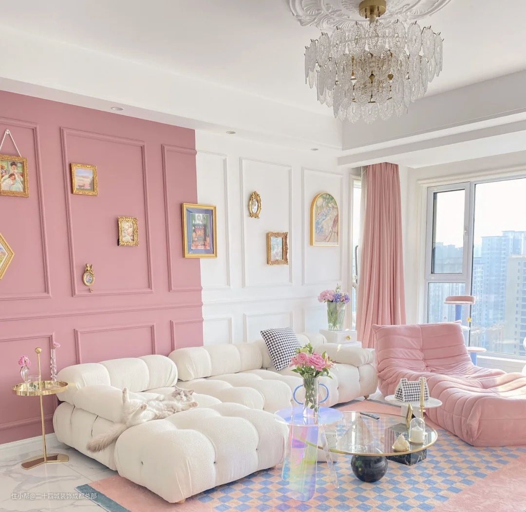 沙发背景墙是白色+脏粉色的乳胶漆,时尚简约,看久了也不会觉得甜腻,挂画搭配石膏线条,空无一物的墙面变得更加丰富,有艺术气息的同时很有高级感。