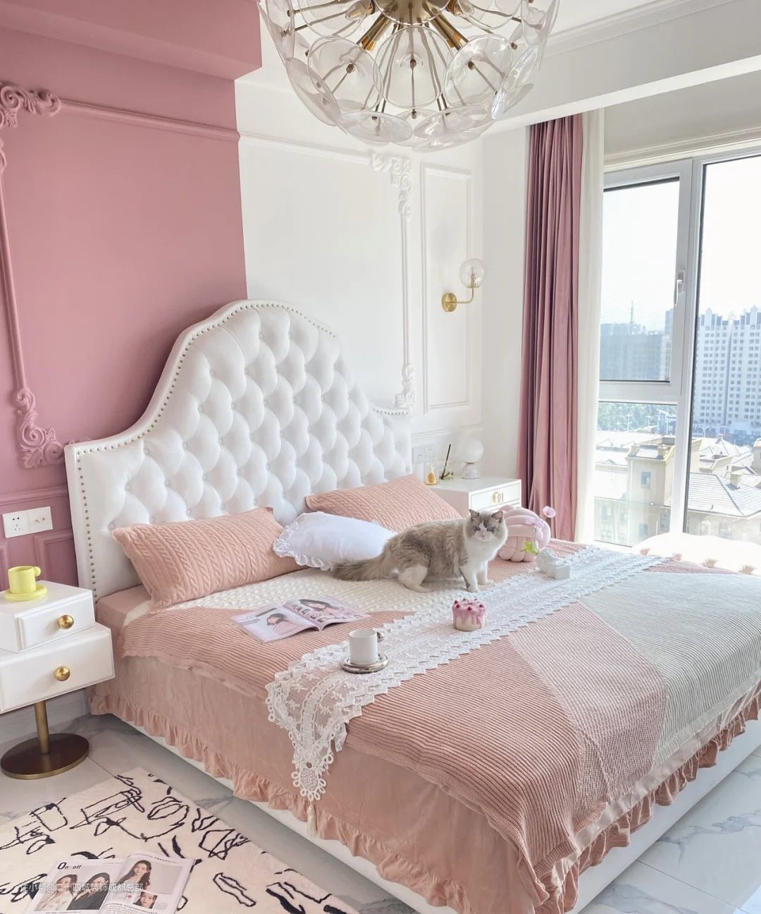 主卧背景墙和客厅沙发背景墙一样,是白色乳胶漆与脏粉色的乳胶漆,很温柔。