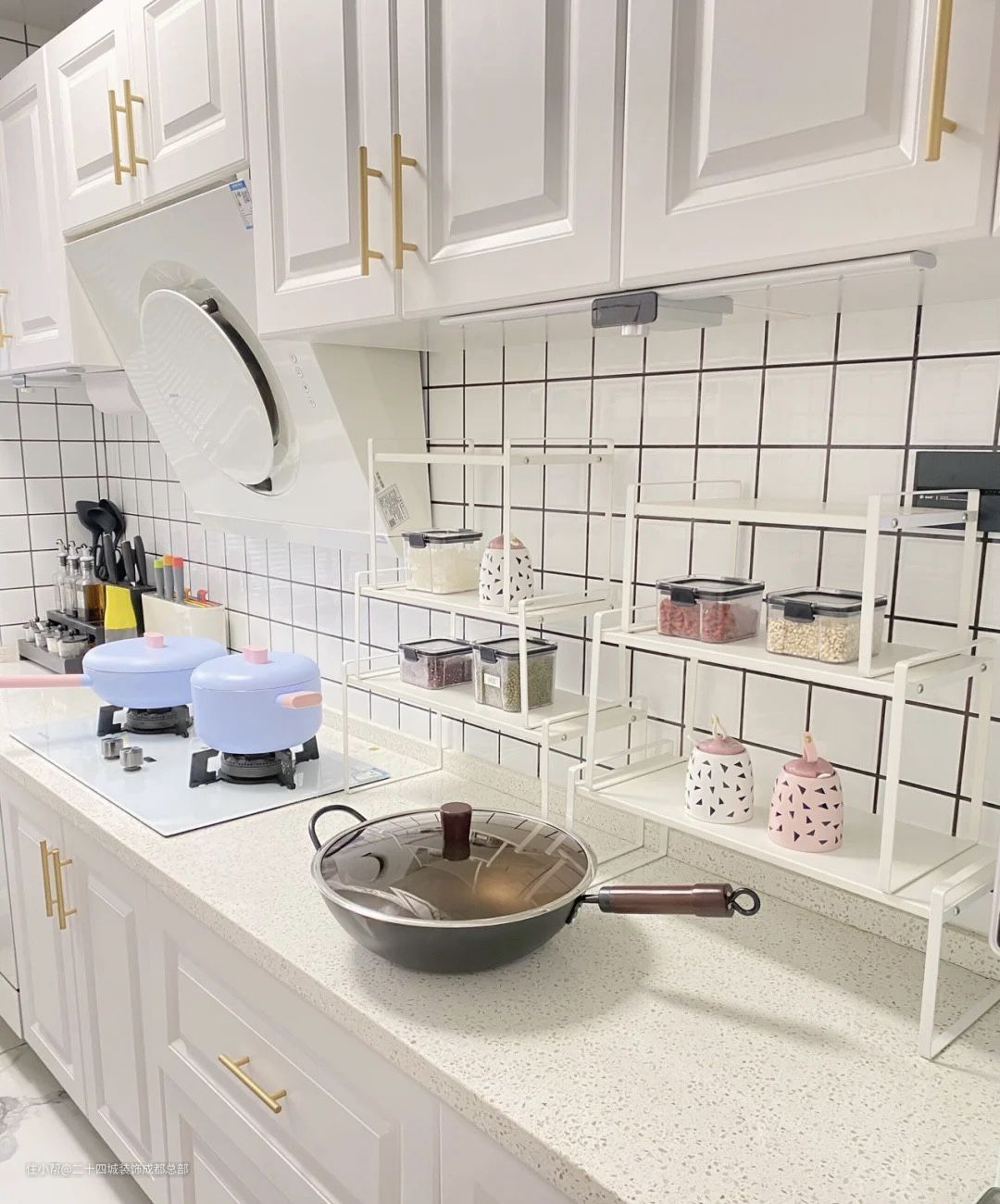 过道放置了白色的置物架,搭配黑色和粉色的小推车,用于放置锅具,容量大,同时颜值还很高,收纳日常所需,非常便利。