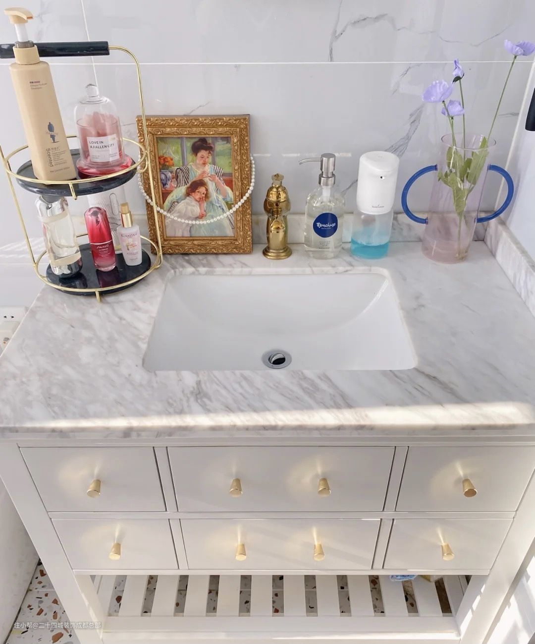 干区设计了金属边框的镜子,和金属的水龙头,搭配台面放置的艺术画,高级、浪漫同时还有质感,小型置物架收纳了洗护用品,保持了台面的整洁。