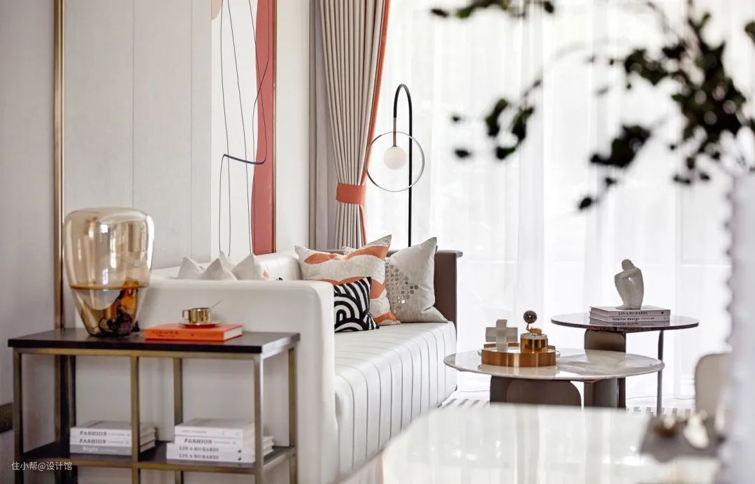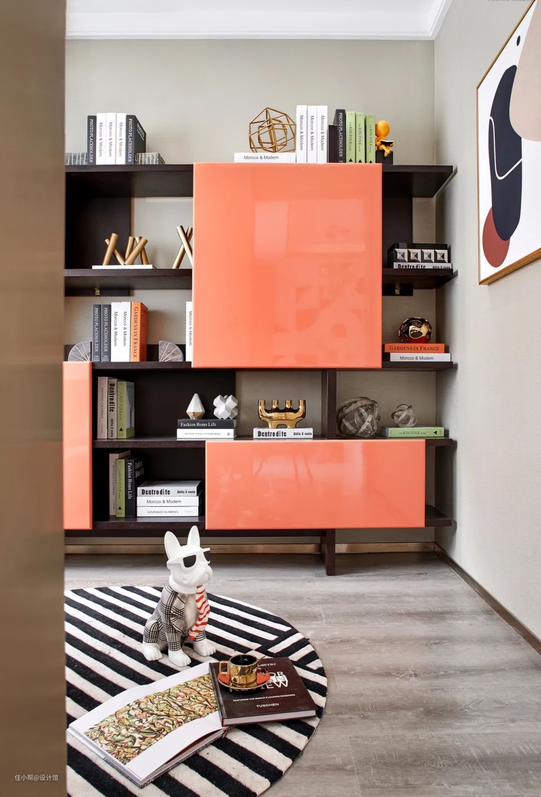 ▲窗帘、抱枕与细节软装上,加入跳跃的橙色,布置在现代端庄的空间下,也使得空间充满活力感。