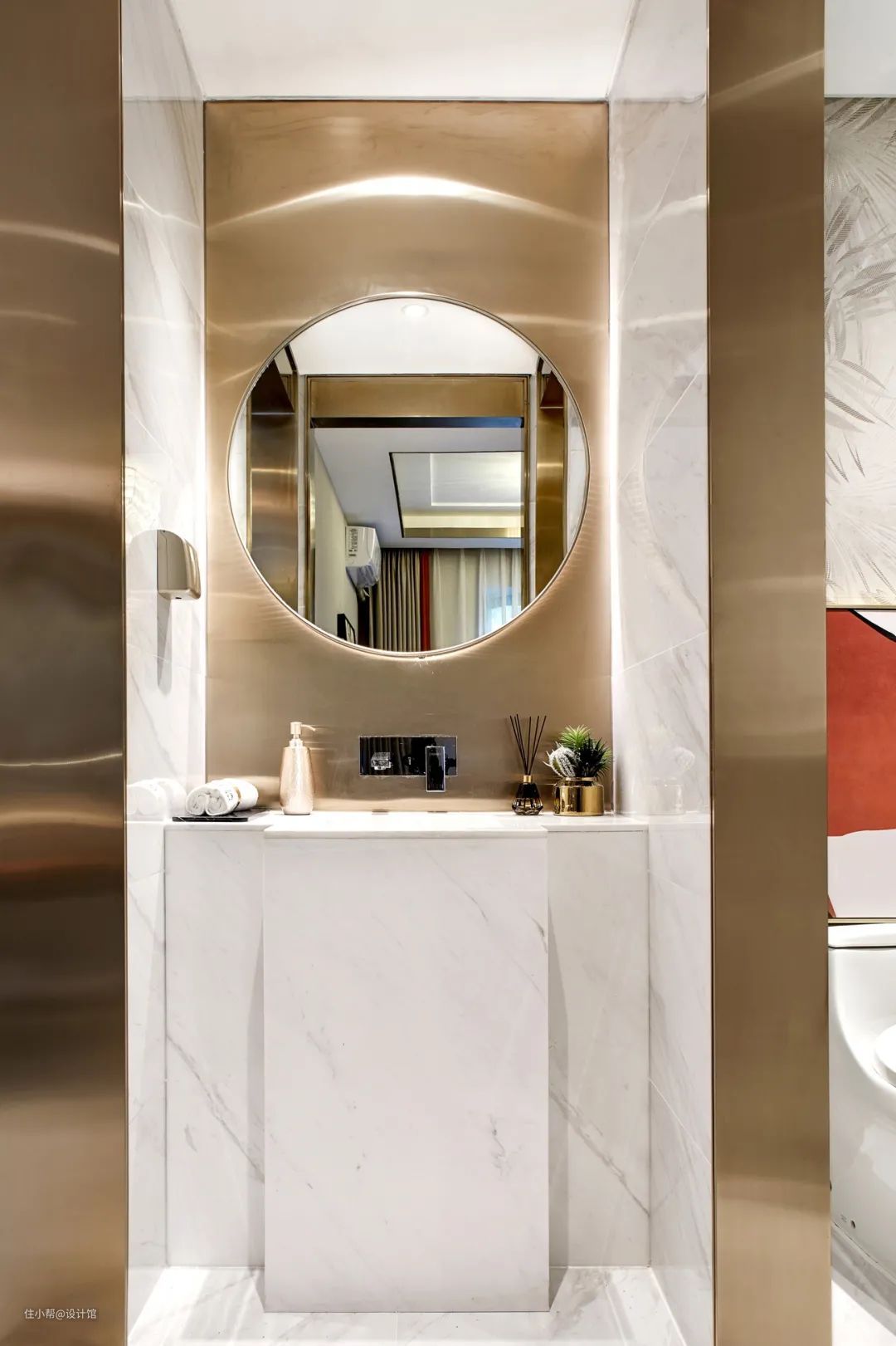 ▲卫生间雅白的大理石与金属质感结合,洗手盆前装一个圆镜,结合洗手盆上的香薰与卫浴用品,带来一个精致华丽的卫浴体验。