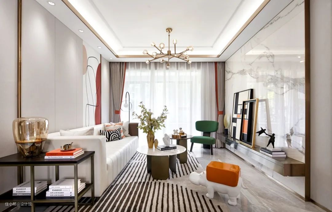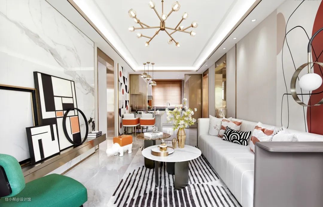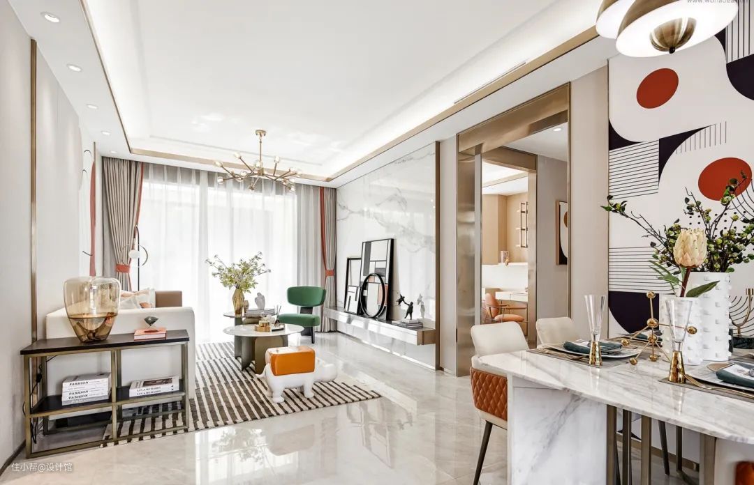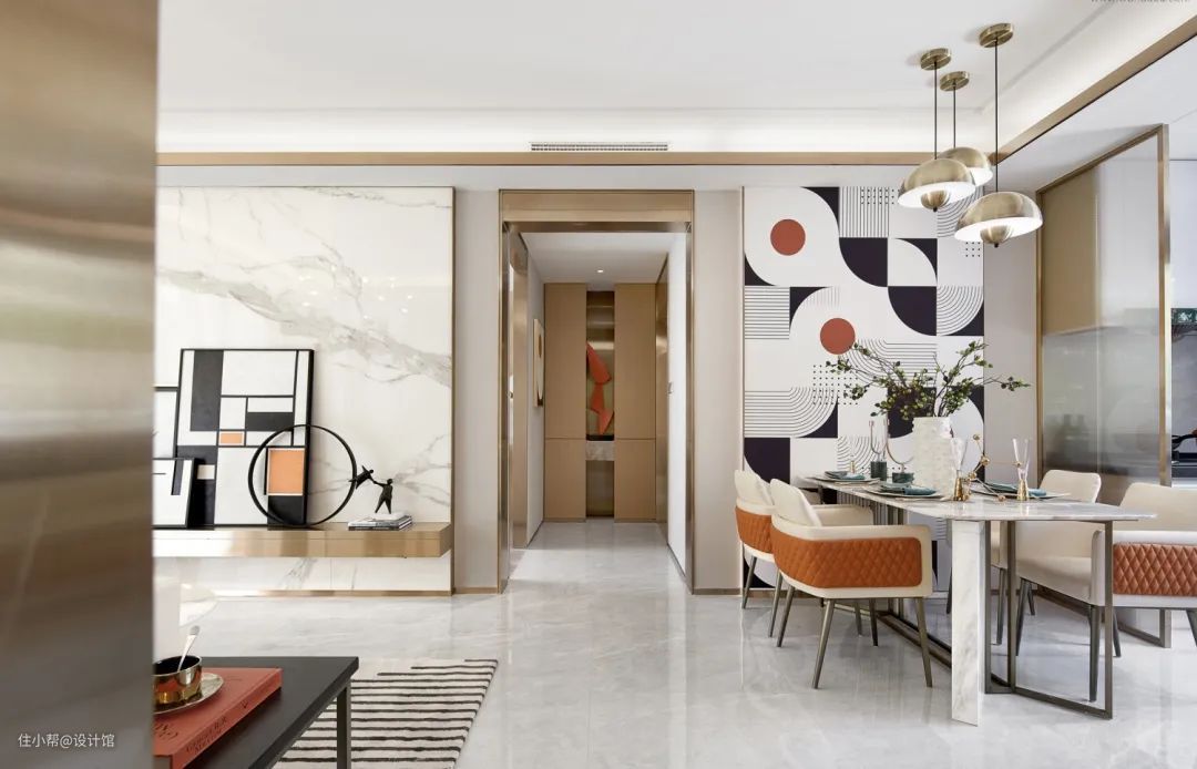 130㎡现代轻奢,大理石与金属质感,加上橙色的软装,华丽高档