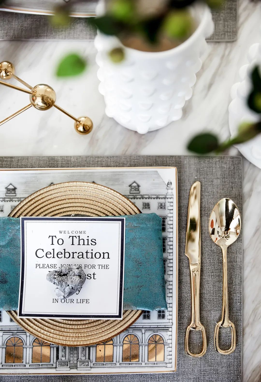 ▲金色的餐具,搭配靛青色的餐巾,在优雅华丽的餐桌布置下,让用餐空间充满高级优雅的仪式感。