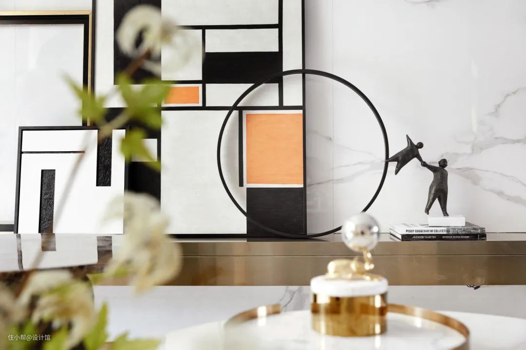 ▲餐厅背景墙是一幅大尺寸的抽象几何艺术挂画,以黑白橙色的搭配为主,布置大理石+金属质感结合的餐桌,搭配橙白配的皮艺餐椅,让空间显得更加端庄高级而精致。