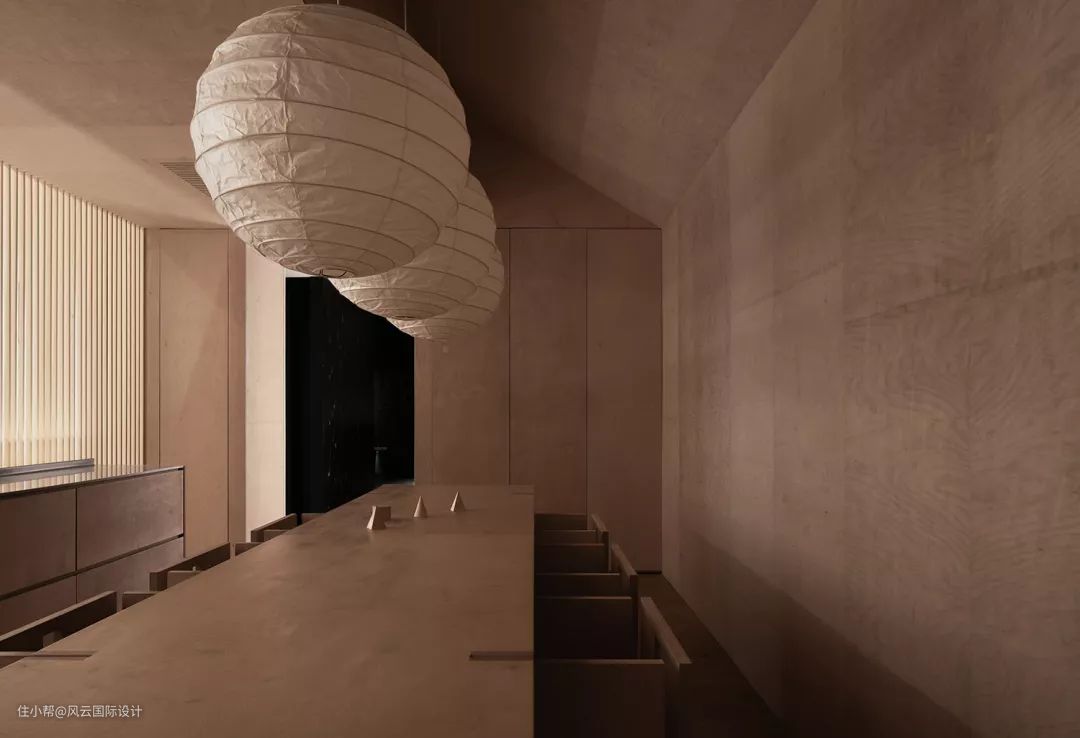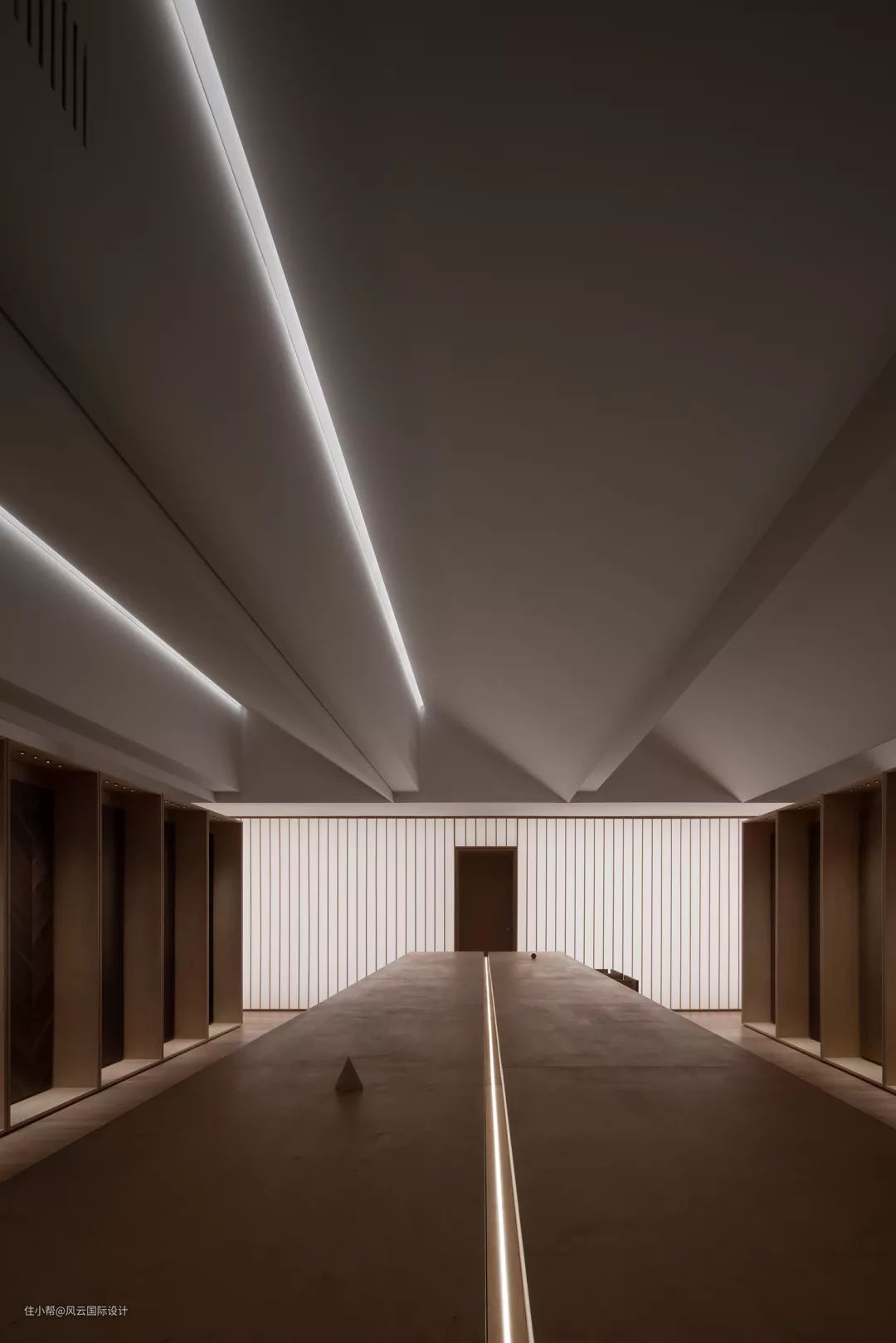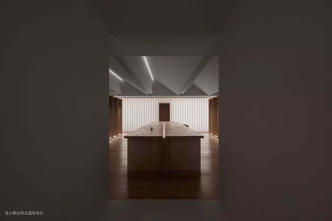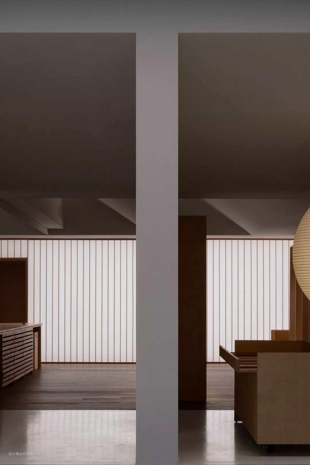 穿过悠长的通道,接待的茶室静待于大厅一旁,茶室一侧设有服务通道,与整个空间连通一起,边界处纤细的格栅过滤了室外的纷扰,坐位区的天花向上倾斜形成凹陷,增加了私密性,给客人安坐的暗示。