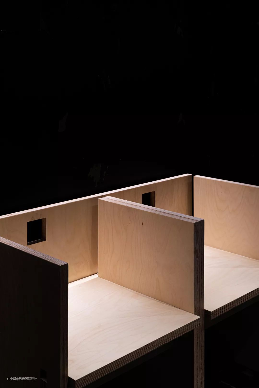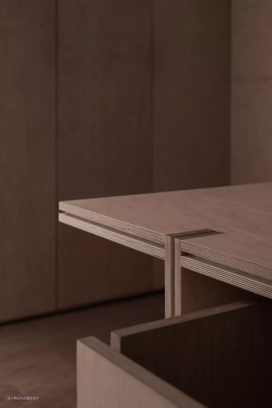 板材之间的拼接处留有更细的缝隙,侧板纹理的交错体现每块用料的尺度和受力结构,对每块材料给予尊重。