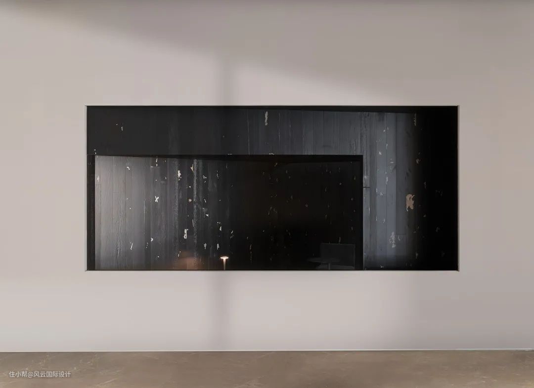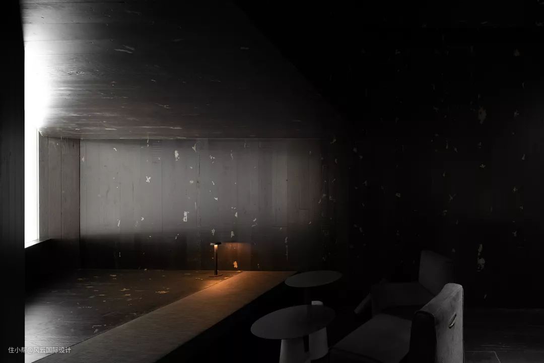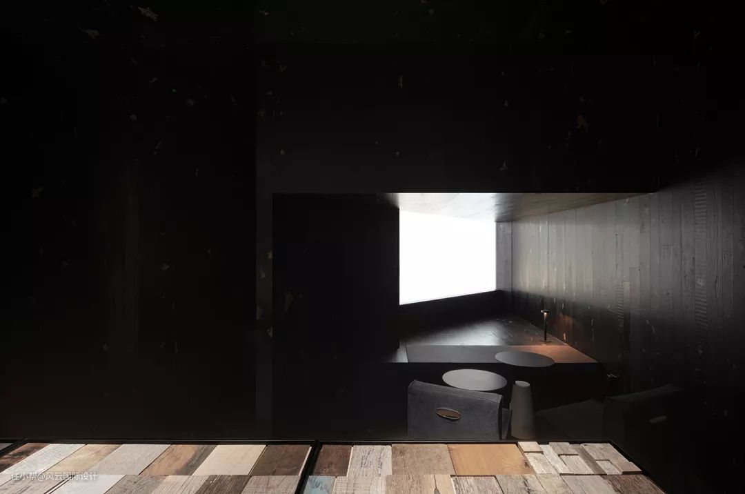 这个空间的墙面地面和天花都被带有自然痕迹的黑色松木所包裹,空间高阔,墙壁有不规则的凹凸,侧面留有窗口,整个洞口被压低,黑色的沙发镶嵌在窗台平面边缘,这一切都隐没在黑暗中,仿佛黑色的洞穴。