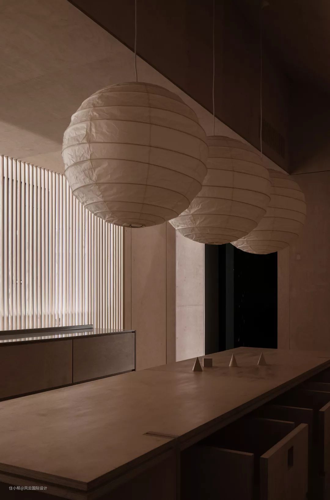 前厅门洞和大厅以同样的中轴线布局,呈现同样的节奏,就像一首音乐的前奏,预示了空间的主旋律。人从洞开的入口进入,穿过前厅回廊,或被硕大的灯笼吸引转身,或止步于放置样板的手推车前。明亮的大厅召唤着,正对入口中轴线的长台,中央有缝隙藏光强调中轴的存在。