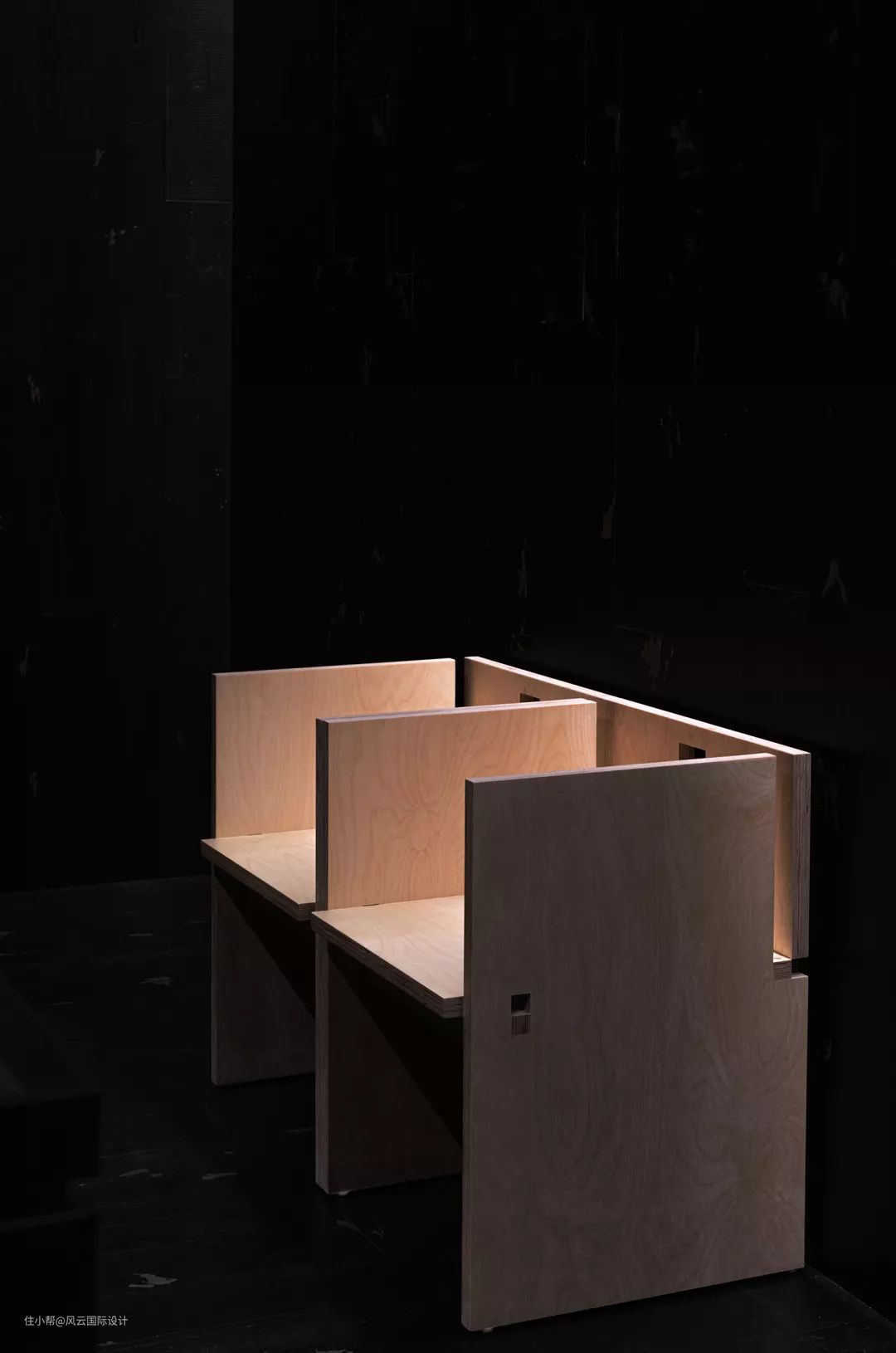 家具作为空间中的小建筑以相同的材料被构建。椅子刚好满足人安坐的尺度,由四块桦木板组合而成,高度刚好可以推进桌面下方,椅背拉手做了与形体呼应的方形镂空,每块板材清晰明了,几把椅子并排放置时也形成类似主空间的旋律,如一种艺术的回响,激荡着人的心灵。