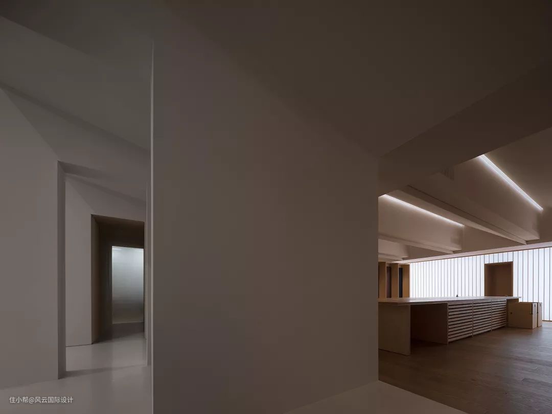 细部决定了作品的精准性,细节在材质交接处被认真地审视,在门洞的入口,墙漆和木质护墙板被细小的缝隙分离开来,以区分空间的内与外,开放性与私密感。