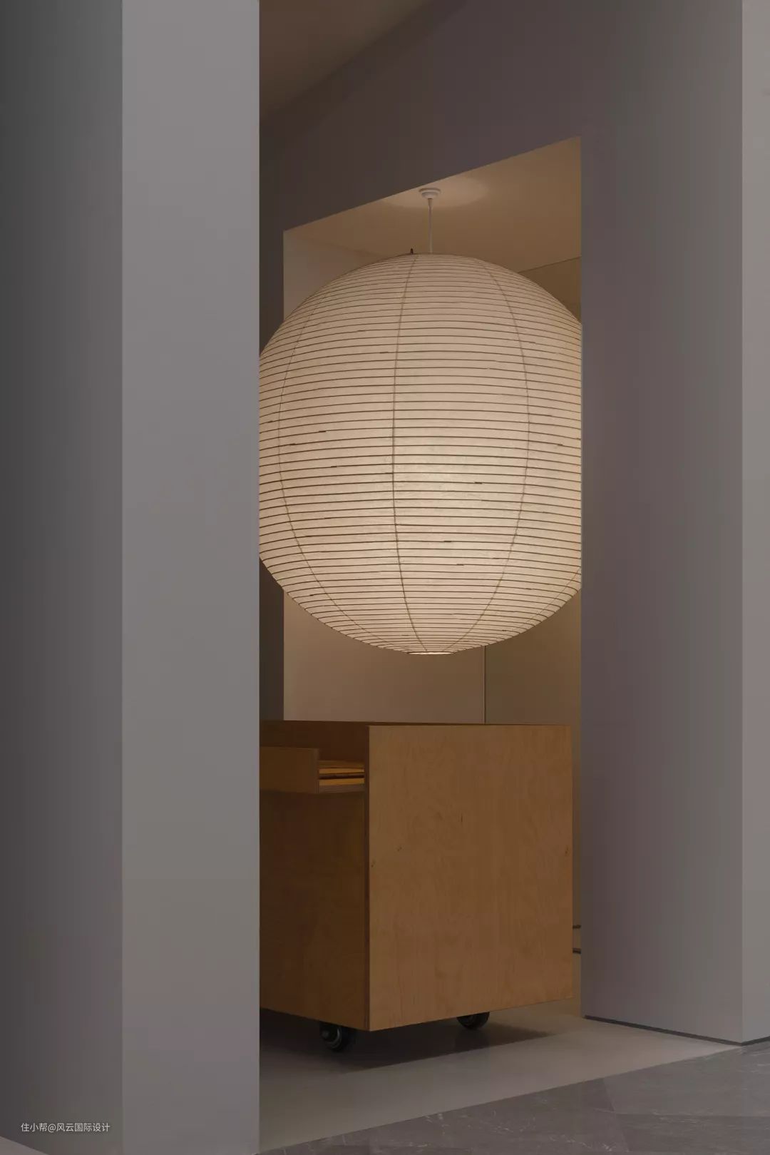入口是幽暗的,过滤了外部的喧嚣,保护了内部的光明。大厅尽头的透光体如此明亮均匀,温润的和纸让光有了触感,可调的亮度和色温可以模拟不同时段的日光效果,以便让展示的样板呈现在与使用环境相同色温的环境中,也可根据自然中的时节和访客的喜好设定不同氛围的光环境。在它的映照下材质纹理熠熠生辉,空间体块层次分明,入口更加幽暗,内部更加辉煌。