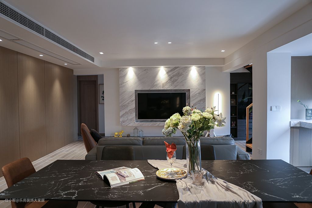 石材的背景墙给人简洁大气的质感,配上皮质的沙发气质拿捏的死死的,再配上当下最流行的岩板餐桌,实用美观结合的妥妥的。