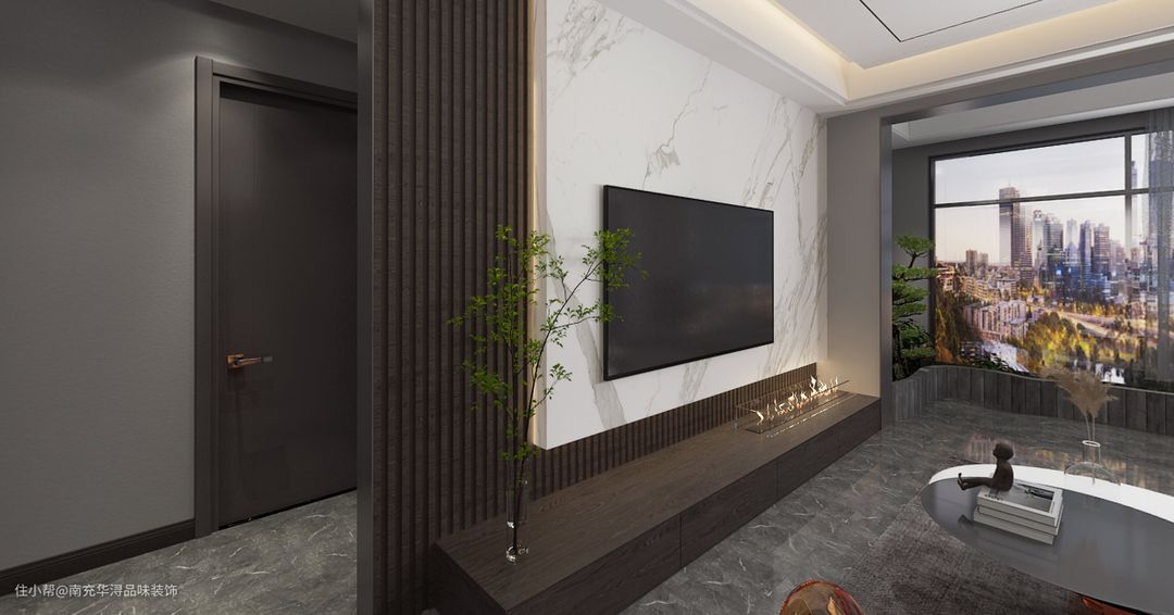 3.高级感大理石,绝对是电视背景墙装修的不二之选,灰色的石材不仅自身高级感十足,更能提升客厅整体的装修档次,让电视背景墙真正成为客厅的视觉中心~