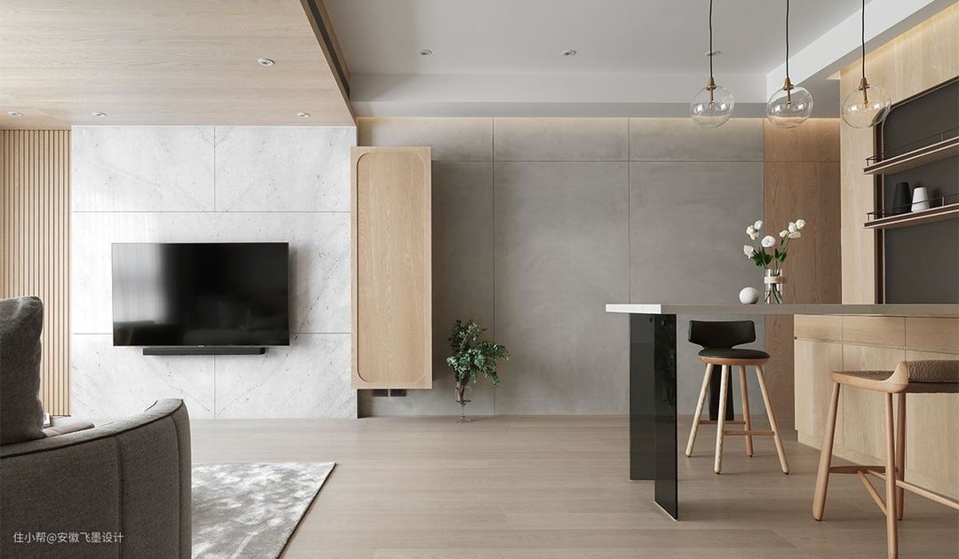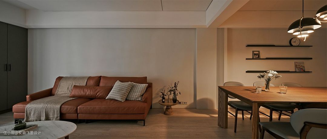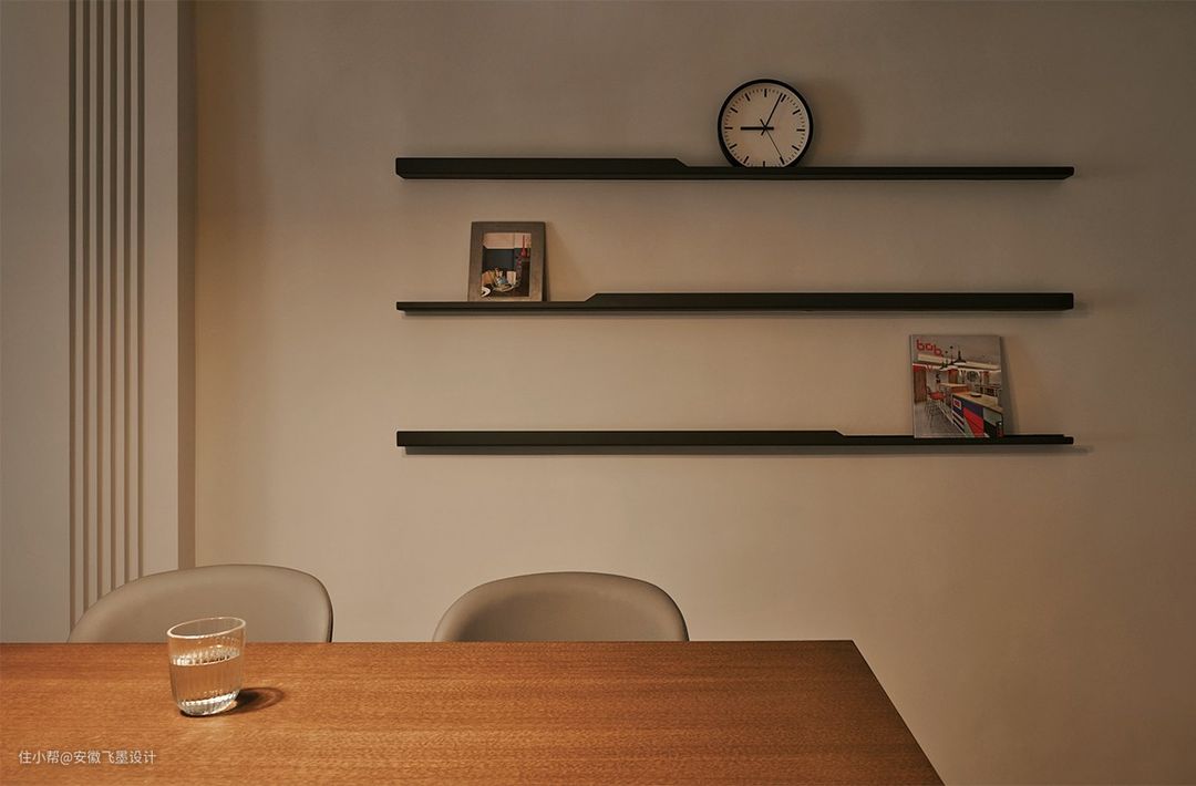 如果能把墙面空间利用好,也可以不用打到顶的餐边柜处理,而是选择给底部打上一半矮柜的设计,和餐桌做个结合设计,平时在这里吃饭用餐的时候,伸手就能够取到想拿的物品。上方一半空间也不浪费,安装钢架置物架,做常用物品的存放,也不担心落灰。