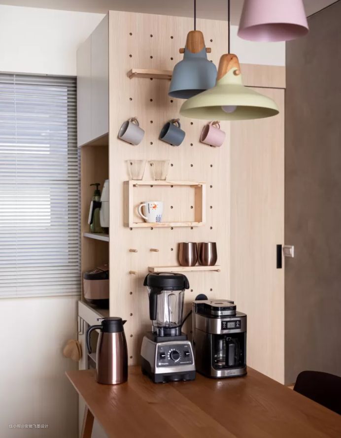 餐桌边墙面也利用上吧:装块洞洞板做背景墙,还能兼具收纳功能