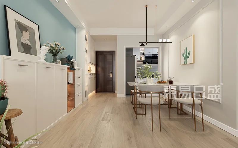 客厅整体色调以蓝灰色和浅灰色搭配为主,用低饱和度的色彩搭配,跳跃和谐。由于业主喜爱绿色所以将绿植融入到客餐厅中,包括墙面的装饰画,显得身临其境的丛林,满足客户对绿色的爱。