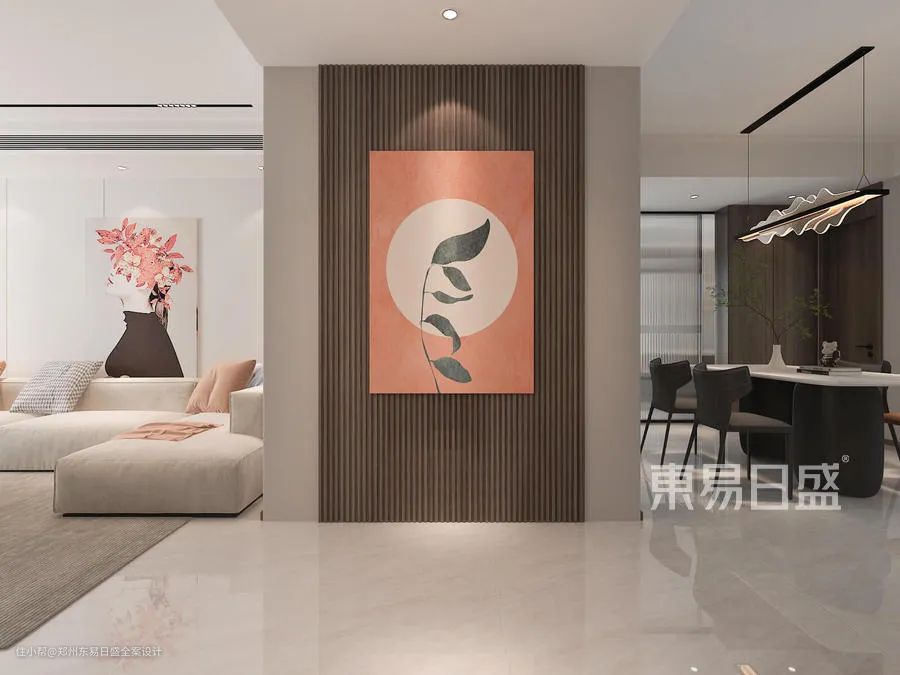 客餐厅墙面做成石膏线彰显立体空间感,简单的北欧风挂画将整面墙衬托出温馨的气息。造型感十足的餐椅给整个北欧风的空间增添了小轻奢的味道。