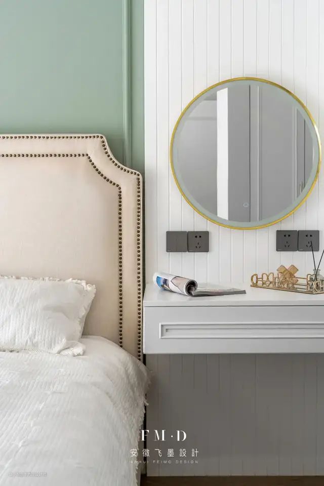 - 在布局上,取消一个床头柜以梳妆台替代,并结合衣柜设计成一体式,将空间利用到极致。