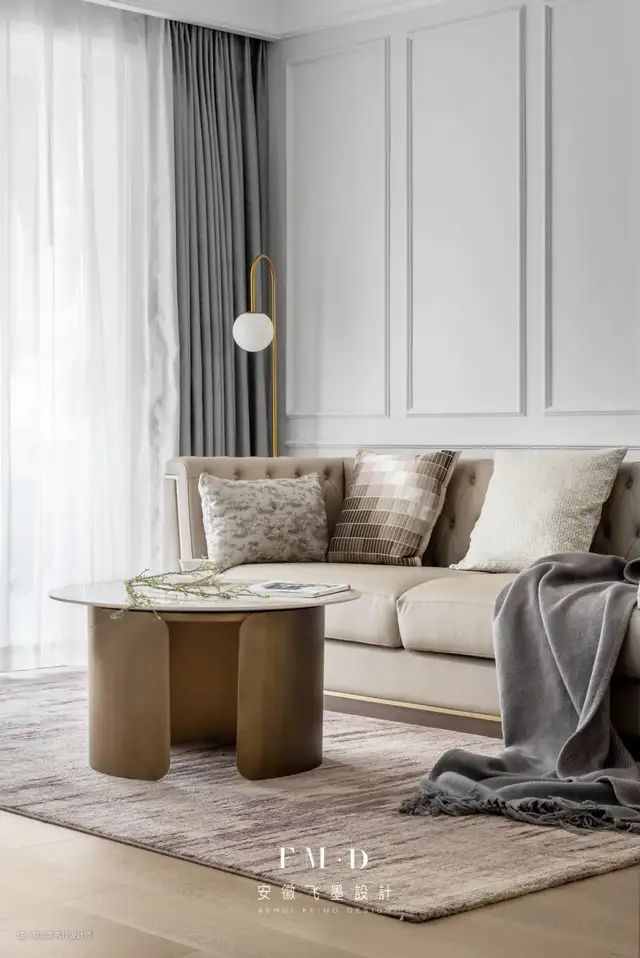 ② 在配色上,整体色调以浅灰打底,与米色共同营造柔和雅致的空间氛围;