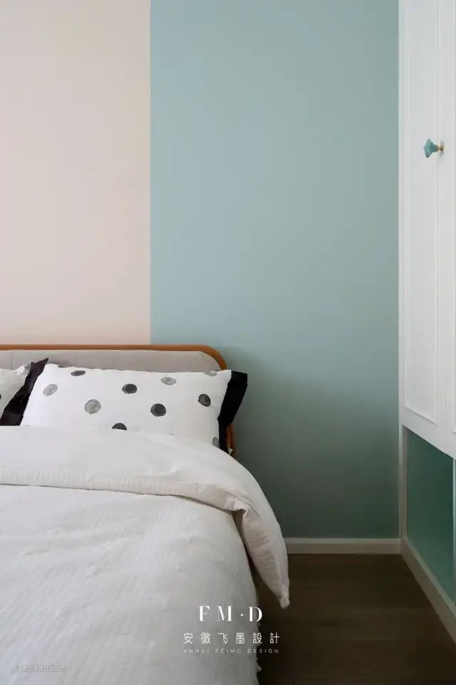 简单的分色墙,浅浅的色调,俏皮可爱,为孩子提供一个舒适的成长环境。