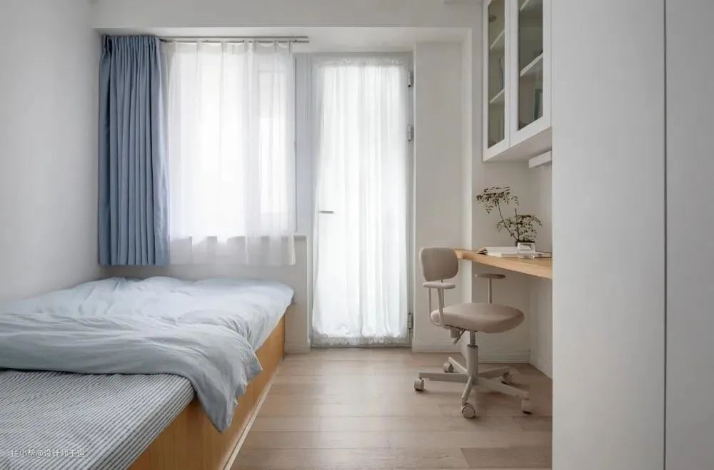 对于小次卧来说,儿童房选择榻榻米+书桌衣柜一体式的设计,空间利用率更高,收纳能力更强