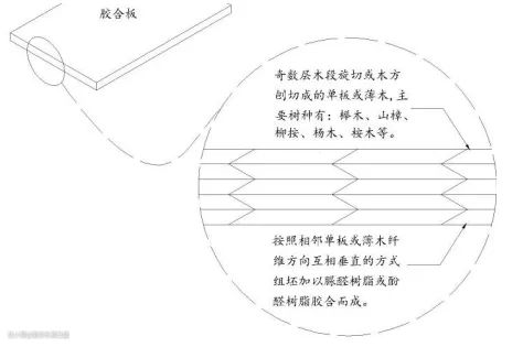 用奇数层单板,并使相邻层单板的纤维方向互相垂直胶合而成。