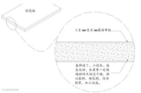 各种枝丫、小径木、速生木材、木屑等一定规格的碎片经过干燥、拌以胶料、硬化剂、防水剂等加工而成。·