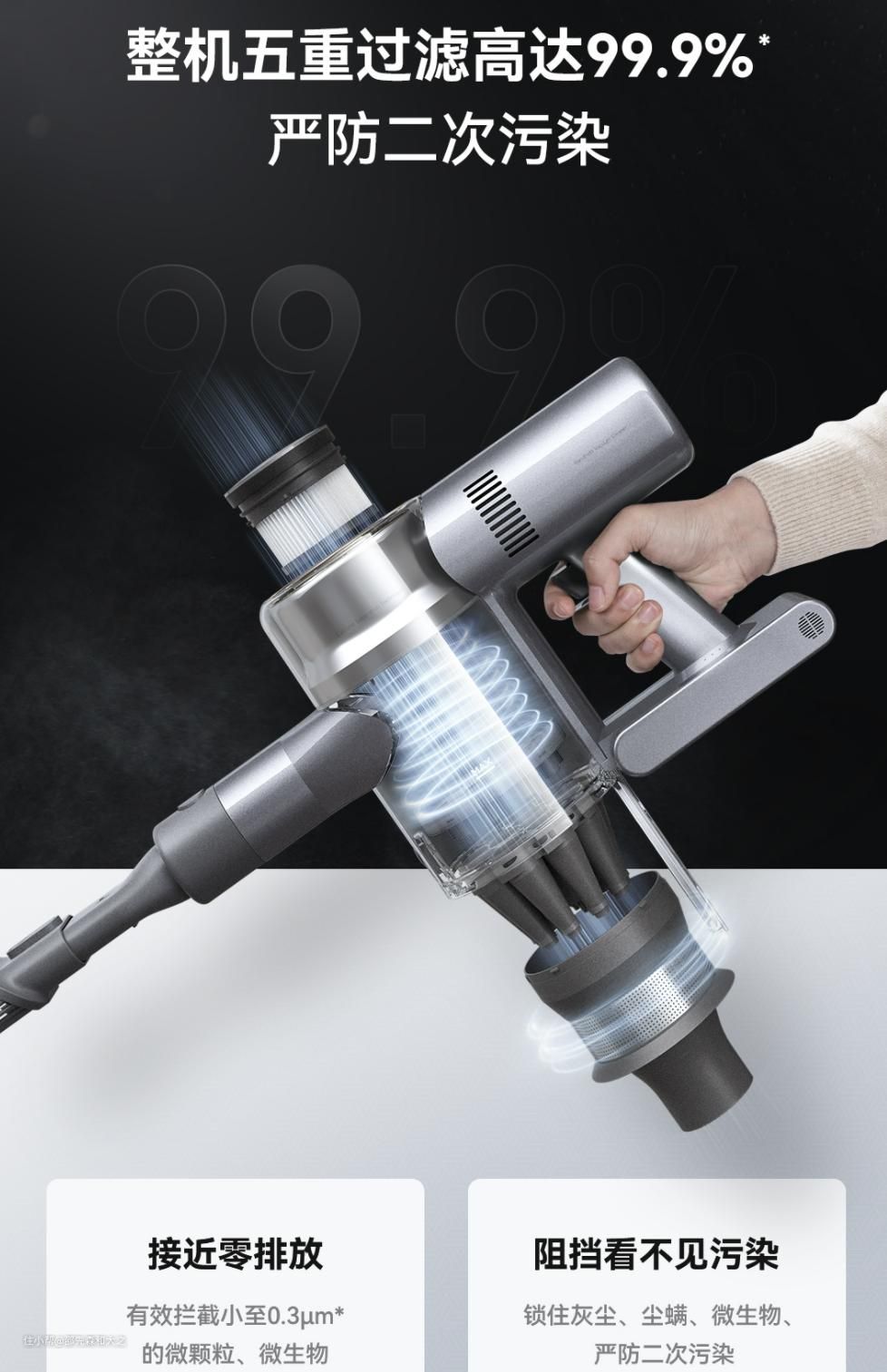 并且,值得一提的是,追觅V16的整机五重过滤高达99.9%,通过12个气旋分离,过滤海绵,金属滤网和Hepa滤芯等,有效的防止了二次污染。