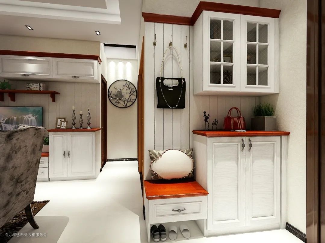 护墙板还可以结合整体玄关柜进行设计,分缝护墙板加上挂钩,随手挂上外套、包包,隔开了墙面与衣物的直接接触,减少了墙面和衣物的磨损,生活品质直线上涨!