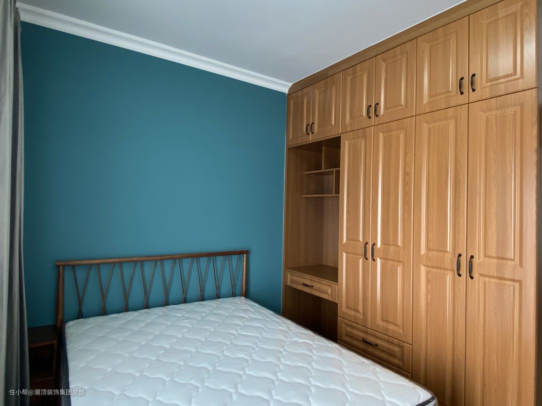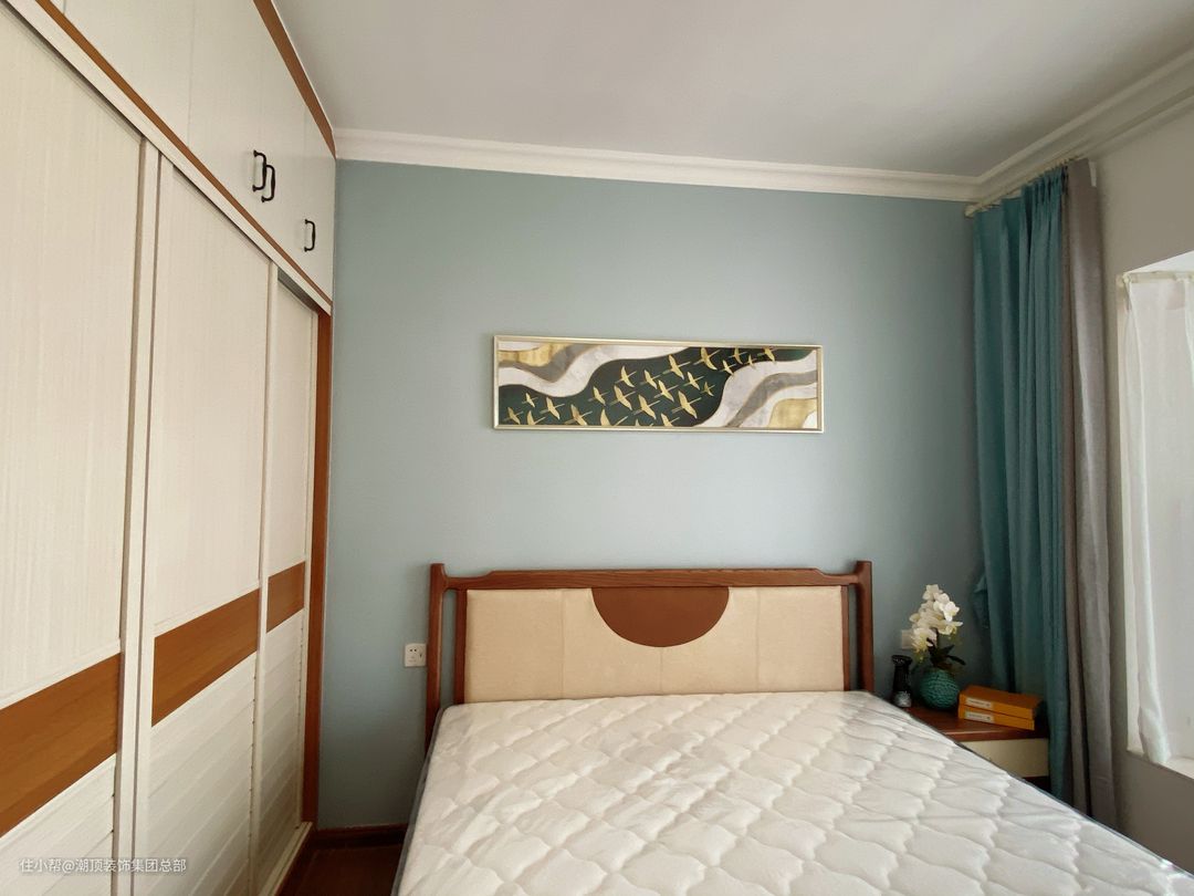 再举个例子,如果卧室大量采用蓝色系,墙纸深蓝、床上、床头都是不同深浅的蓝色,再搭配一个同色系的浅蓝色窗帘,整个氛围就会变得活泼又小清新。