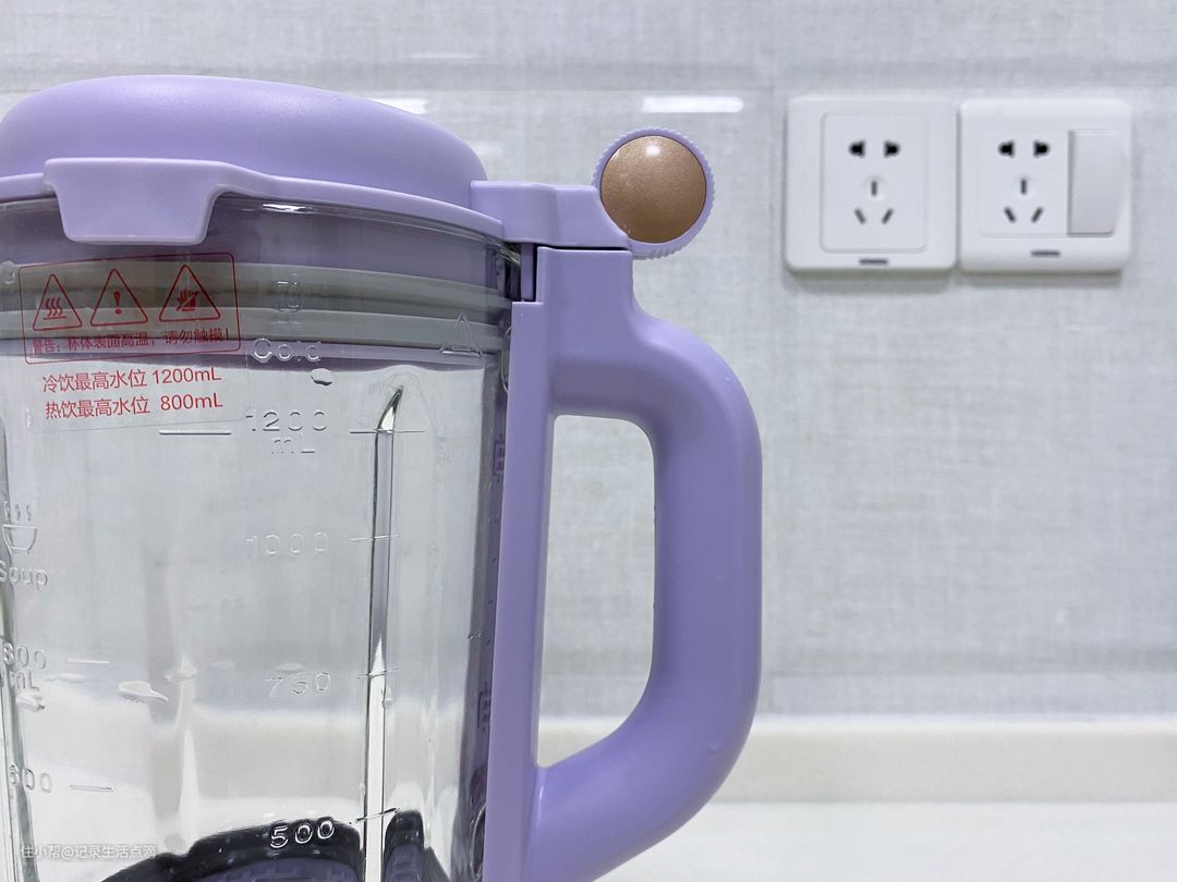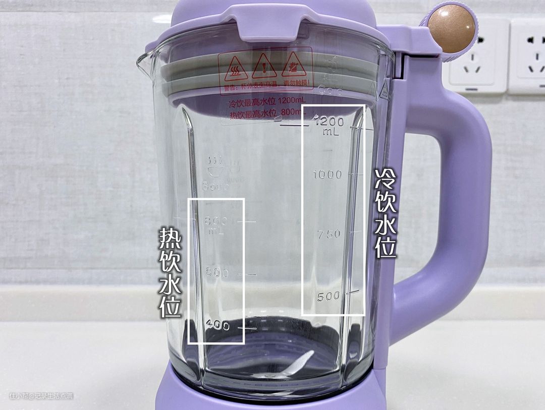 在杯体上有凸起的刻度标记,左侧是热饮水位,最大为800ml;右侧是冷饮水位,最大为1200ml。杯体容量适中,足以满足三口之家使用,例如早上榨豆浆,一次可榨800ml,一家三口每人可以喝250ml多,不多不少恰到好处。