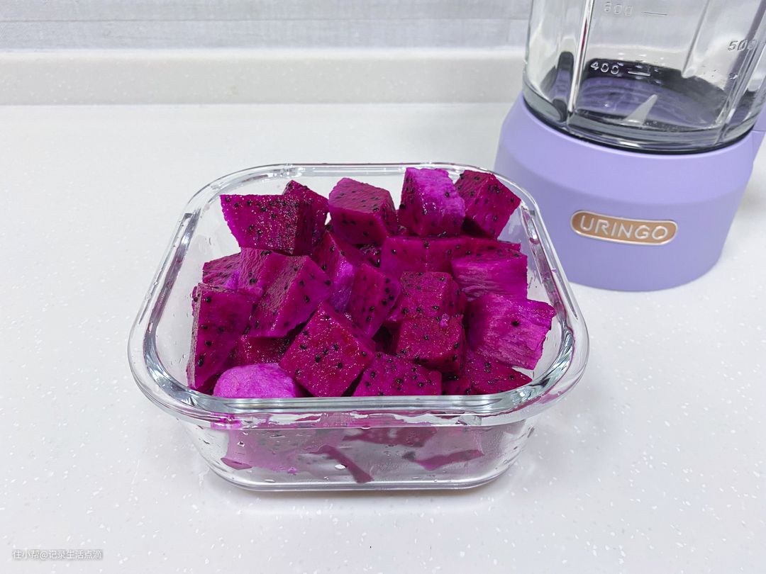 再来试试破壁机榨果汁的效果,家里正好有火龙果,那就榨点火龙果汁吧,看看破壁机能不能把火龙果中的小籽打碎。