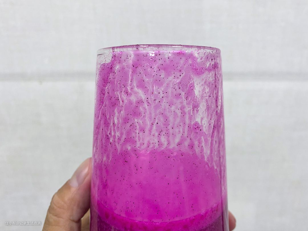 来看看破壁机的威力,火龙果的果肉中布满了黑色的小籽,破壁机竟然把它们都粉碎了,这表现还是比较让我震惊的,破壁机的破壁能力果然名不虚传啊。