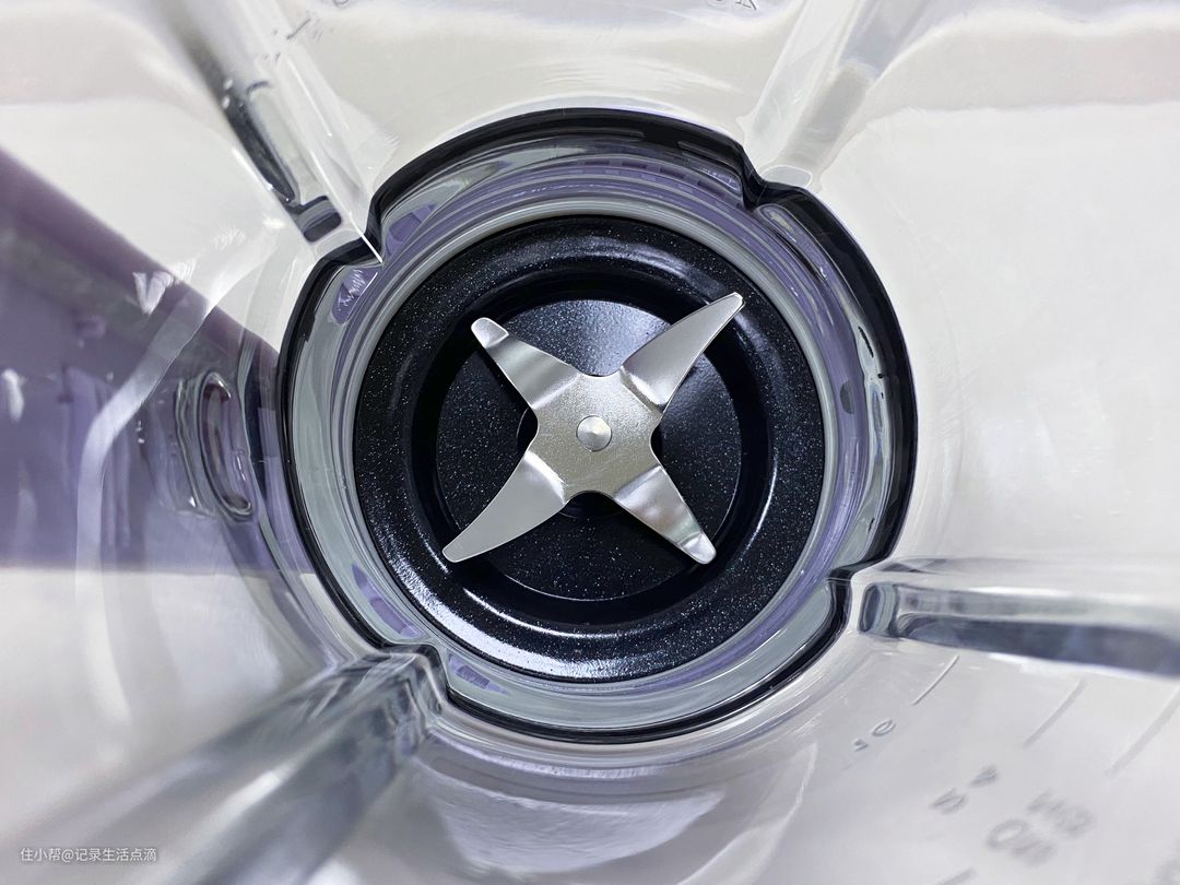 七彩叮当破壁机采用了四叶一体刀头,个人推荐选择这种一体成型的刀头,市面上有些破壁机会采用立体刀头,虽然刀片多,但使用后污垢会藏在重叠的刀片之间,清洗起来会比较麻烦,而且毕竟刀片锋利有受伤的的风险。大家仔细观察可以发现杯体上还有四道棱,这四道棱与四叶刀头可实现立体全方位搅打,实现更佳的破壁效果。