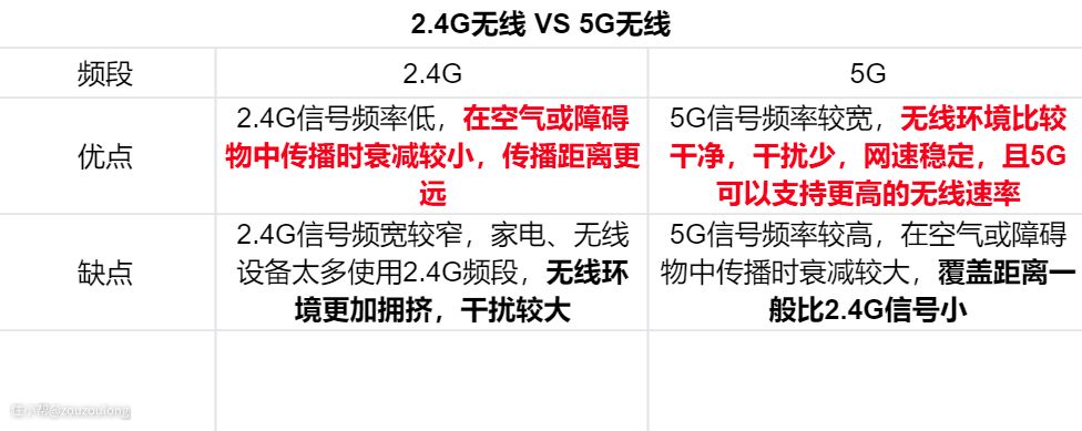 5G无线和2.4G无线的对比,相信小伙伴们已经看过很多了,总结起来如下表所示: