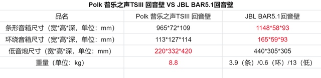 我将我感兴趣的Polk 普乐之声TSIII 回音壁、JBL BAR5.1回音壁的各部件尺寸、重量相关参数列了个表: