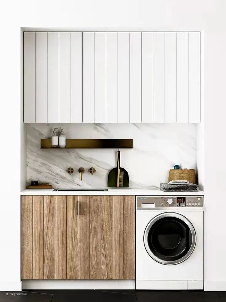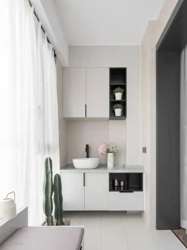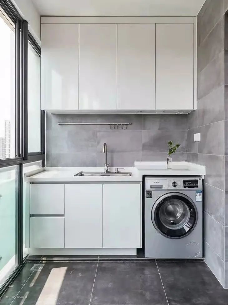 阳台做洗衣柜,基本都是吊柜+地柜的设计(吊柜也可以换成隔板)。
