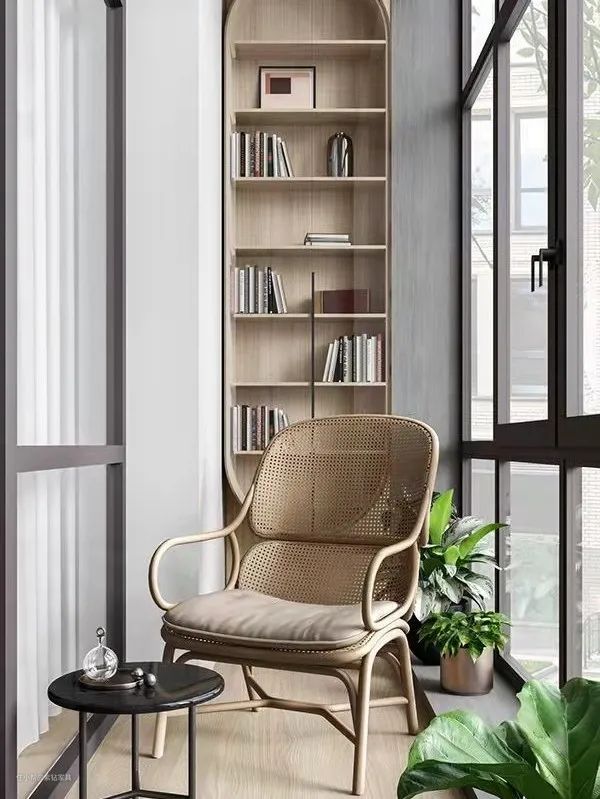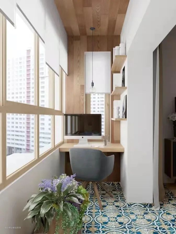 假如你家的户型稍有余裕、洗衣机不一定非得放阳台,那么你的阳台还可以改造成纯储物柜的休闲区,或者是做书柜+书桌一体的改造书房。