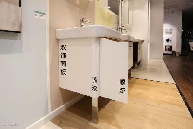 上 以这个浴室柜为例,侧面的板子是正常规格,正常用双饰面和封边。正面的柜门和转角柱都是异型,只能用喷漆做饰面和封边 图源:住范儿北京样板间