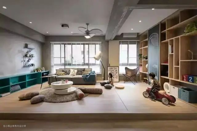 如果想让孩子直接可在地板上玩耍,也可以在整个客厅区域做一个地台,地面抬高20-30cm,每天打扫好卫生就好。