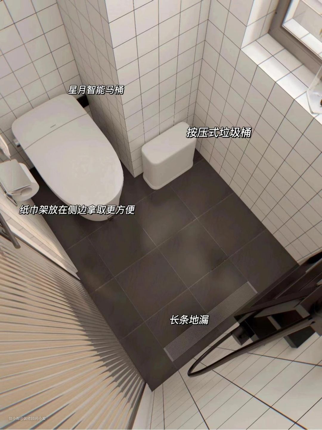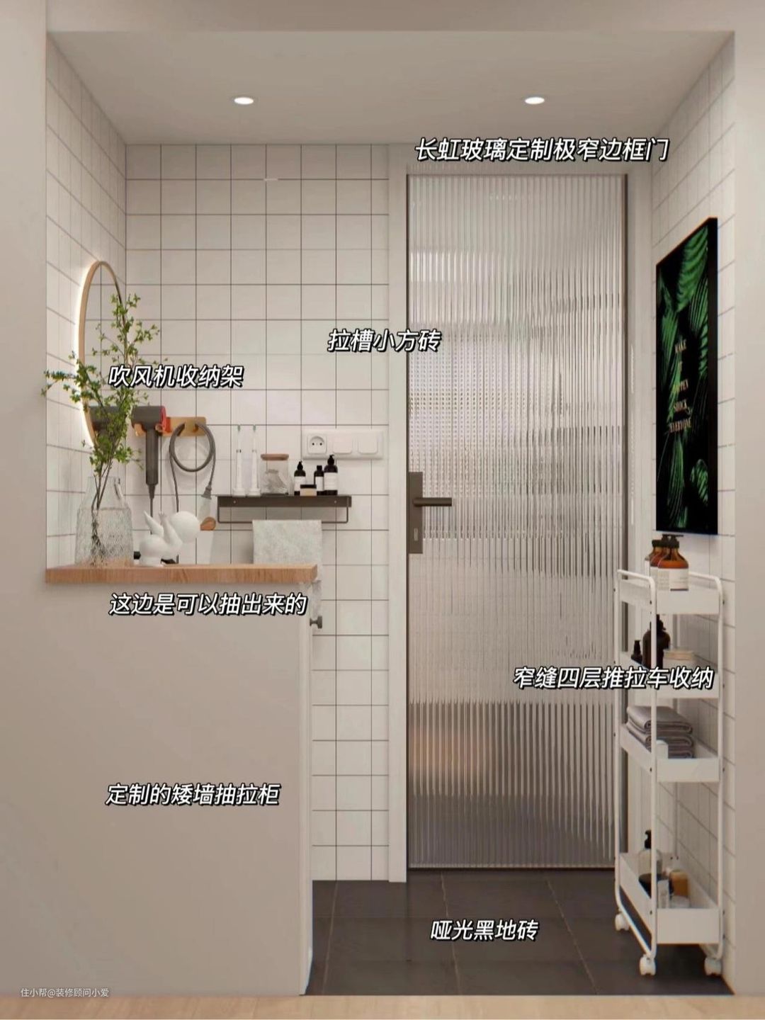 将卫生间的干区外移,和客厅过道相连,黑色亚光砖和矮墙区分两个空间。