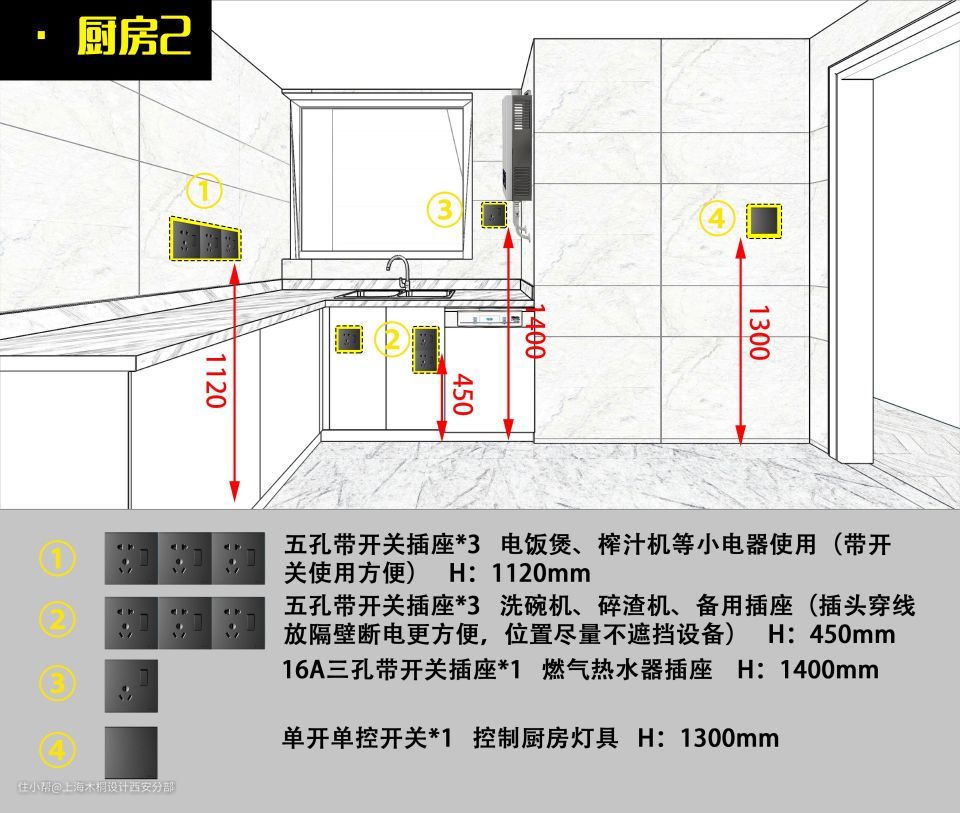 厨房电器的种类繁多,所以需要先确定好电器的位置后,才能确定插座的位置。常见的电器有:烤箱、消毒柜、冰箱、油烟机、燃气热水器、洗碗机、净水器等。而且很多都是大功率的电器,插座需要16A的三孔插座,同时布线最低4平方起。