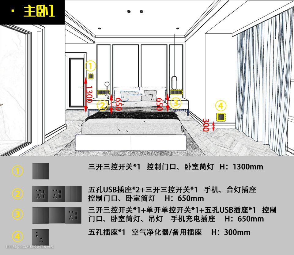 进门口设置开关,与床头两边的开关形成双控/三控,开关灯更方便。两侧床头柜则需要预留2~4个带USB插头的五孔插座,玩手机会更舒服。侧边的墙上可以预留一个五孔插座,像落地灯或者空气净化器也能用。