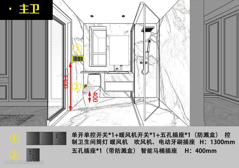 客卫与主卫的插座预留一致,灯开关+吹风机插座+智能马桶插座,基本就能满足所有的功能。