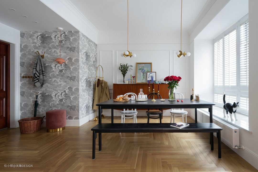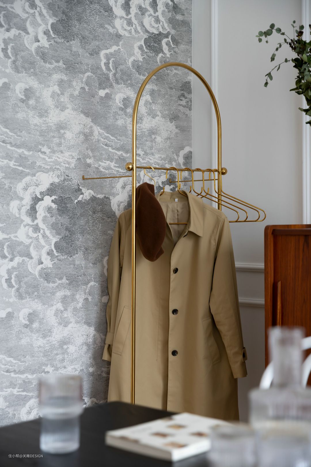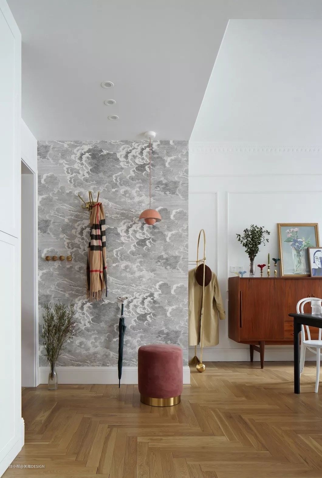入户玄关处中性色壁纸加上暖色调的换鞋凳和小吊灯,让整个空间的温度有了前奏。