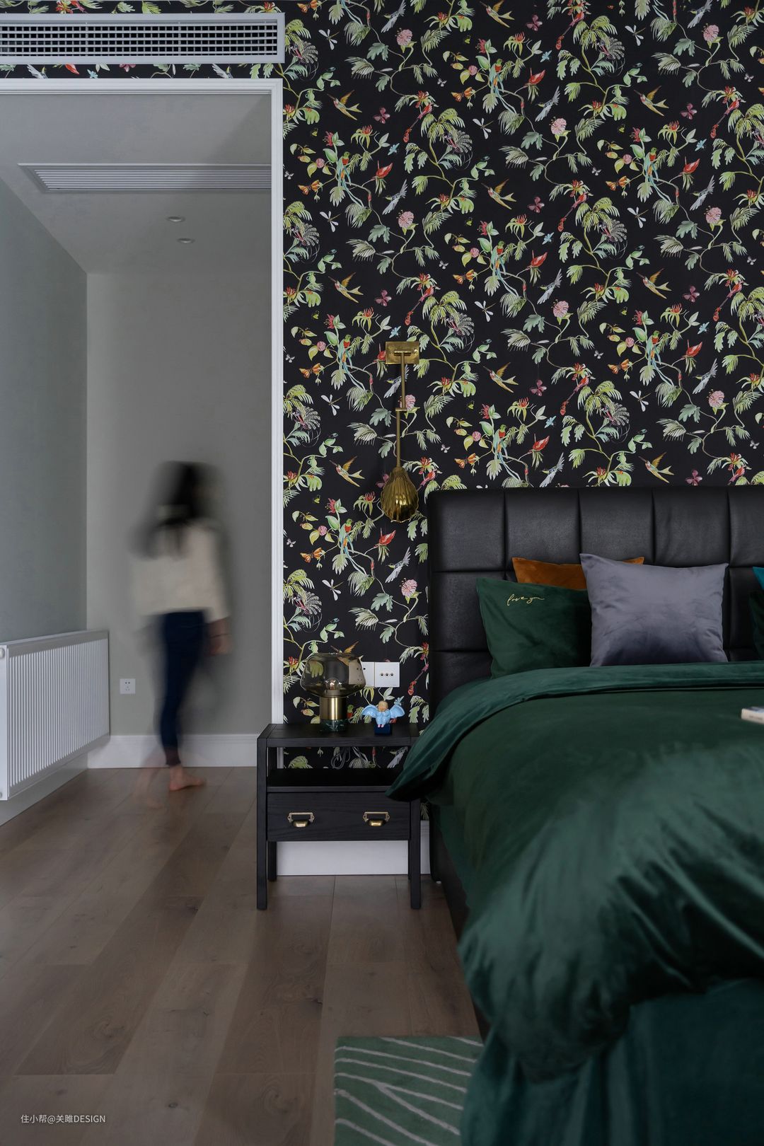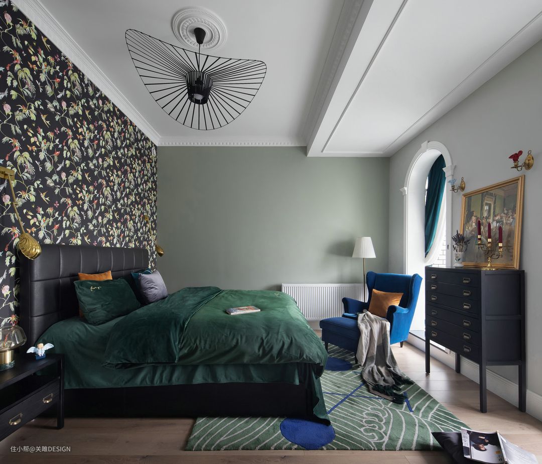 来自雨林的壁纸,黑色是土壤,绿色是生命,剩下来的都是生活;坐在床头,透过拱门与绒帘,可以感受来自浴室的春风沐雨