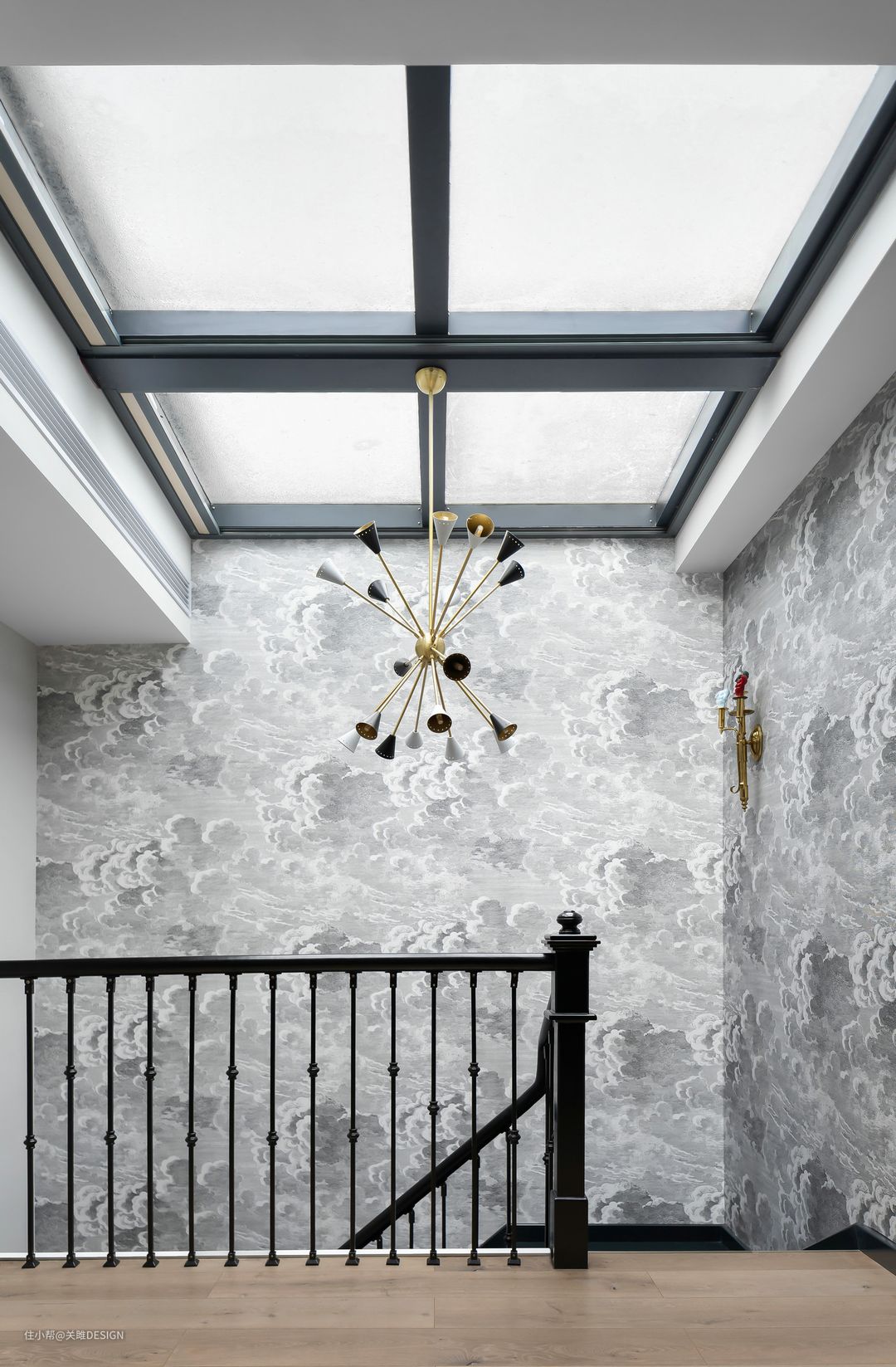 完成后的楼梯间,我们选用了乌云壁纸从一楼铺满到二楼,直到触碰到天光。预留出来的玻璃顶面,也预留了中央空调风口和顶面遮阳帘,解决长沙为时两个月的火炉天气。