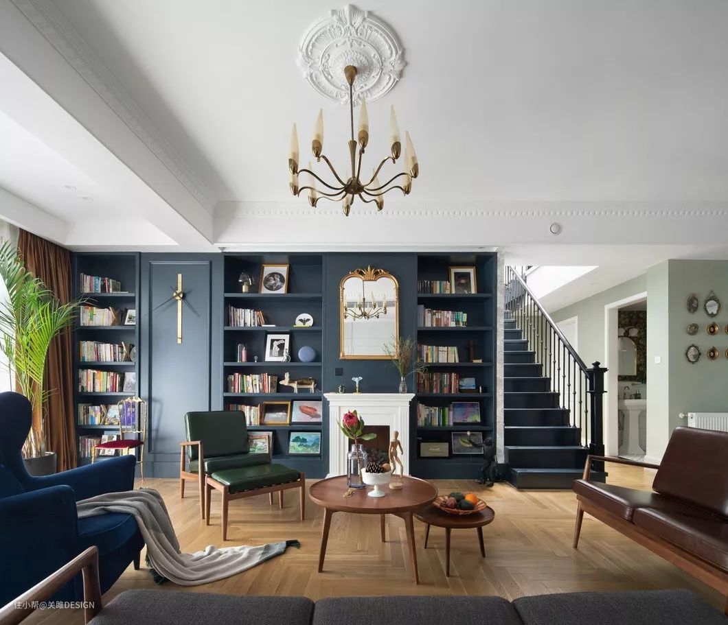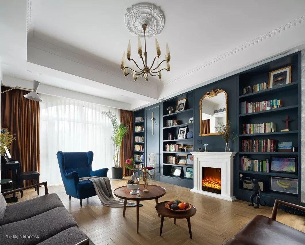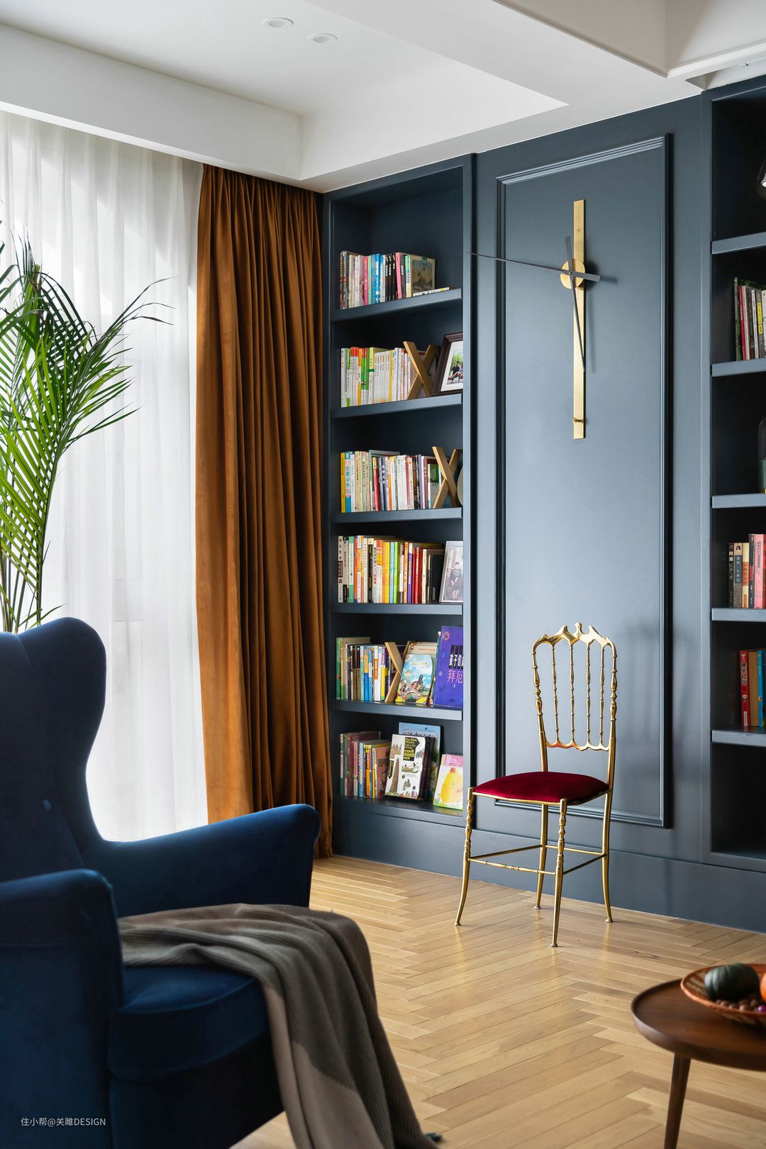 起居室是一个家庭精髓所在之地,一儿一女的四口之家,用文艺的书架代替了电视背景墙,增加了幕布,闲暇之余一家四坐在一起阅读看电影享受属于他们的休闲时光。