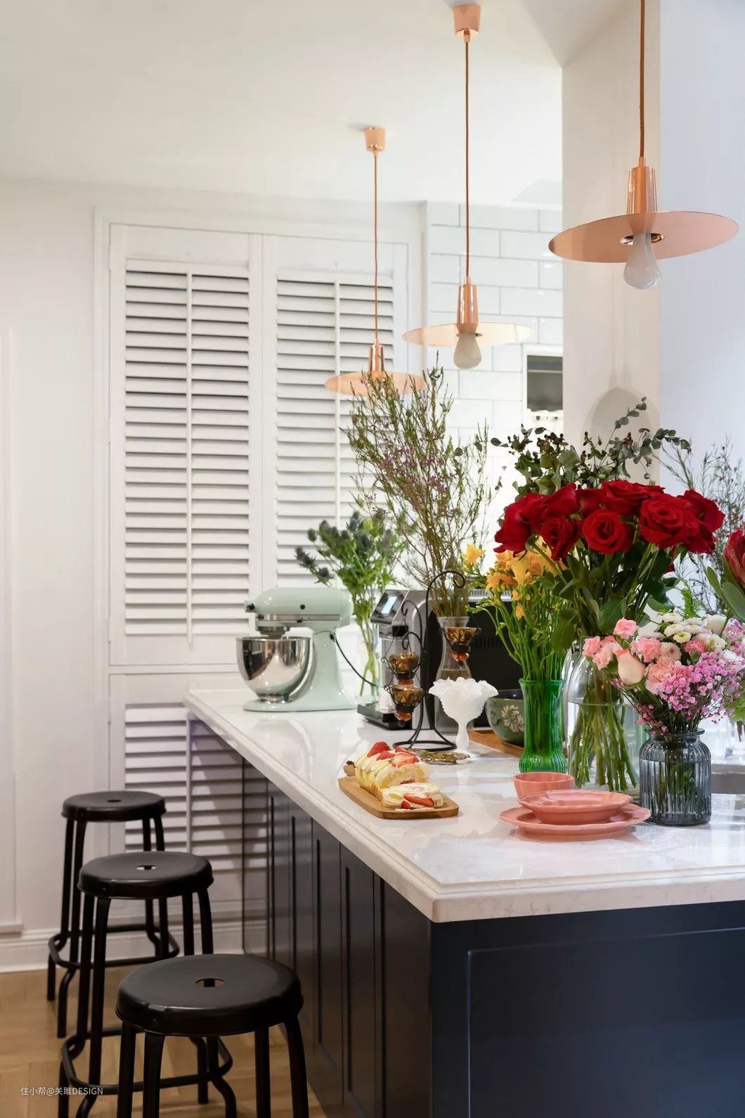 除了鲜花,来自各个国家的各种厨具也特别的抢眼,颜值高且实用。台面可以容下多台机器,我们安排足够的插座。KID似乎很适合这个位置,墙面的绿让它更加精致了。